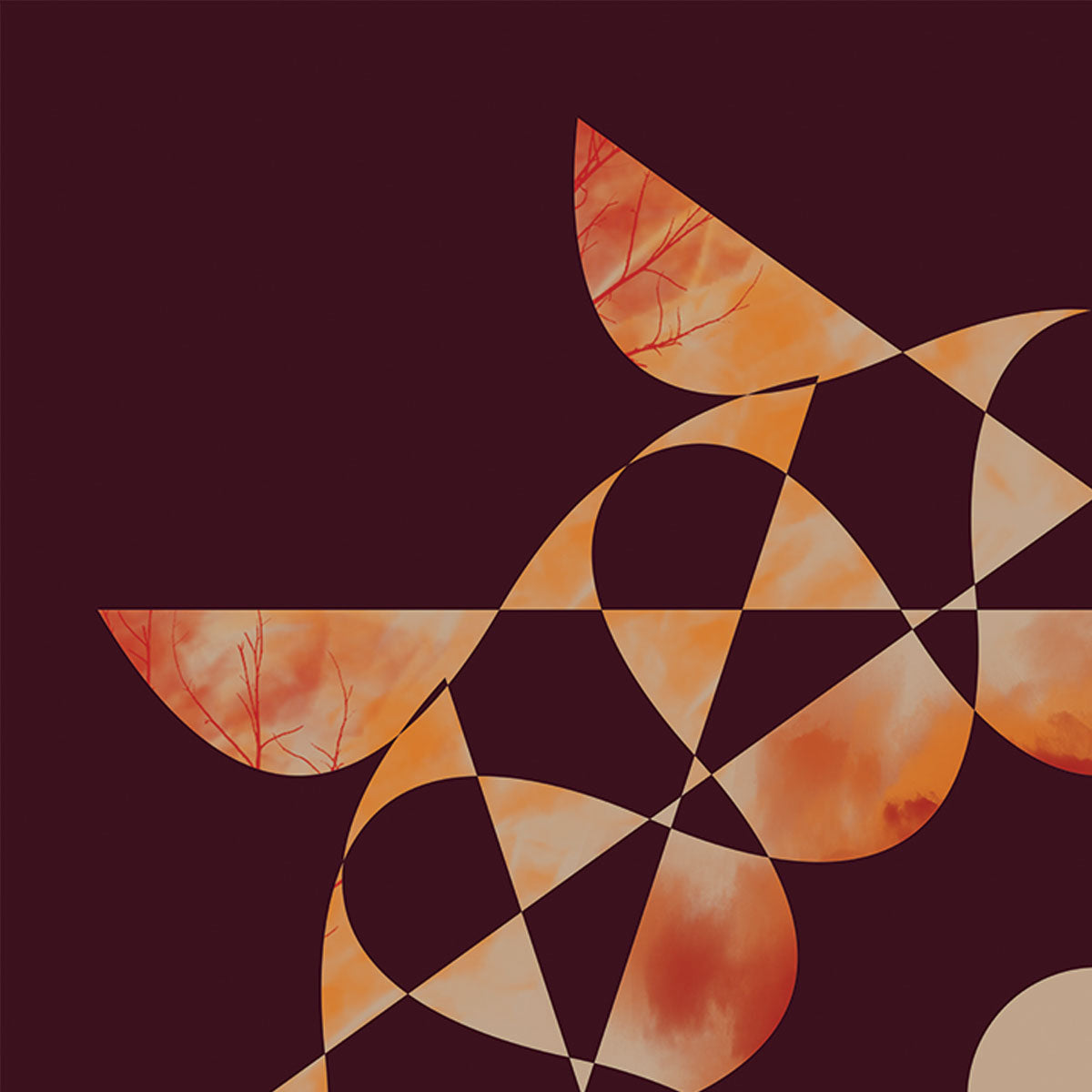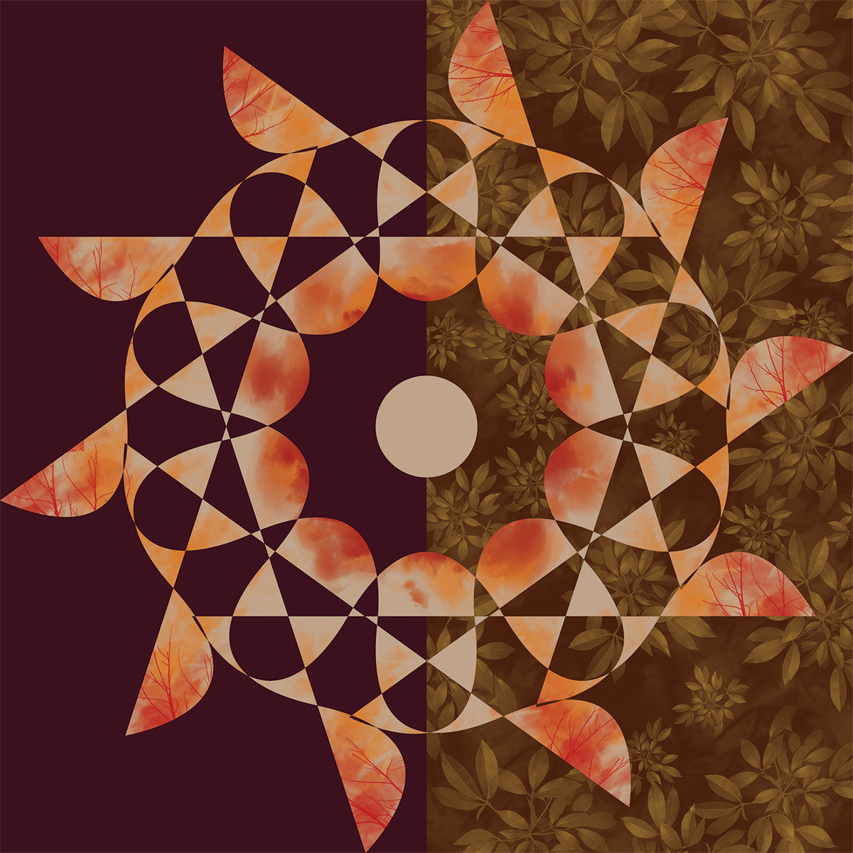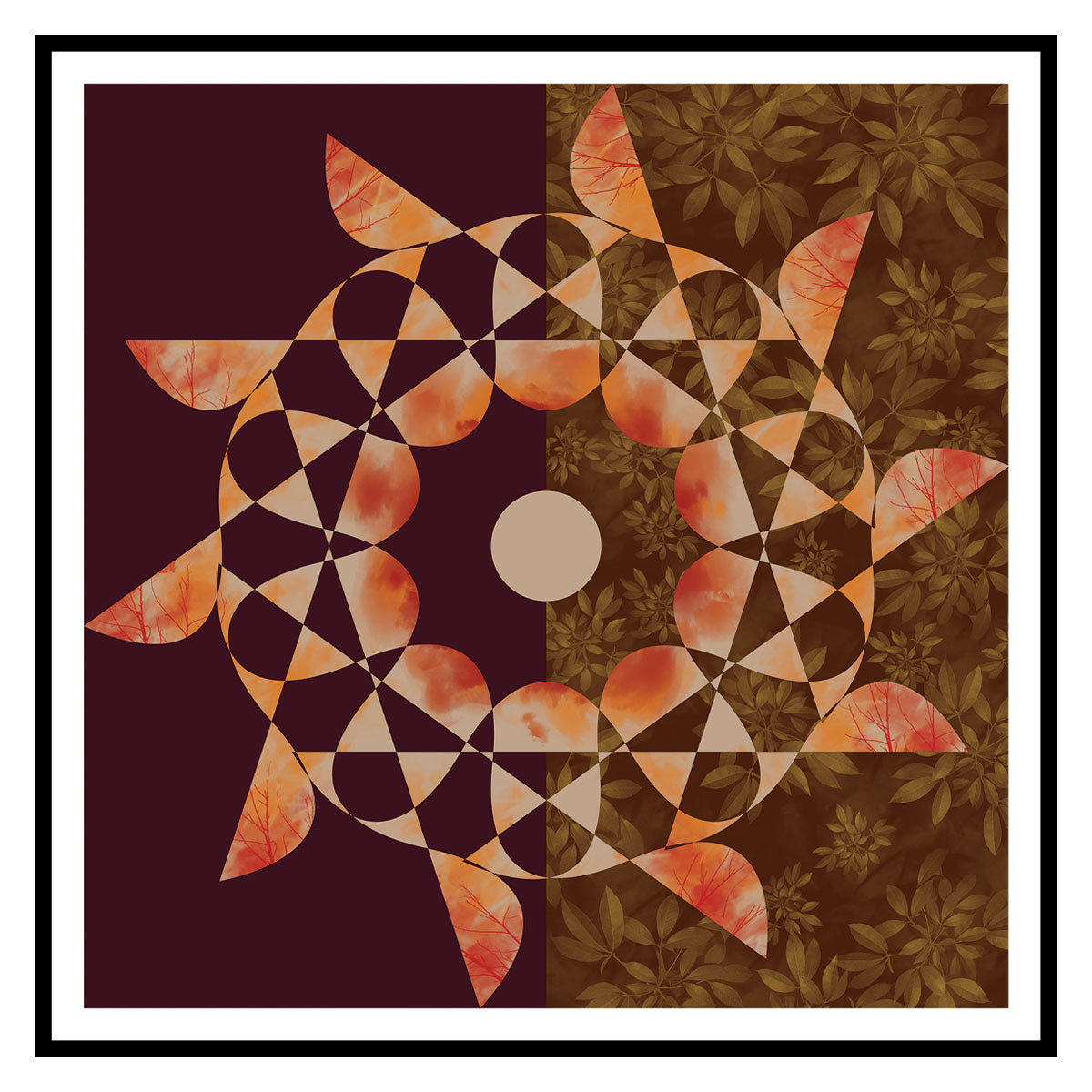 This artwork captures a harmonious fusion of geometry and nature, evoking balance and transformation. The circular motif, composed of interlocking arcs and triangles, symbolizes unity and the perpetual rhythm of life. Warm tones of orange and earthy browns blend seamlessly with subtle botanical patterns, evoking autumn’s serene energy and the beauty of natural cycles. The contrasting halves—one deep and solid, the other textured with foliage—suggest the coexistence of structure and spontaneity. Its intricate symmetry invites reflection, while the organic color palette soothes and grounds the viewer. As an abstract piece, it enriches any space with warmth and depth, encouraging mindfulness and connection with the natural world through its meditative visual rhythm and harmonious interplay of color, form, and pattern.